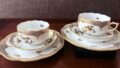 - プレートやティーカップの縁にゴールドの装飾が施されているものが多く、高級感があります。